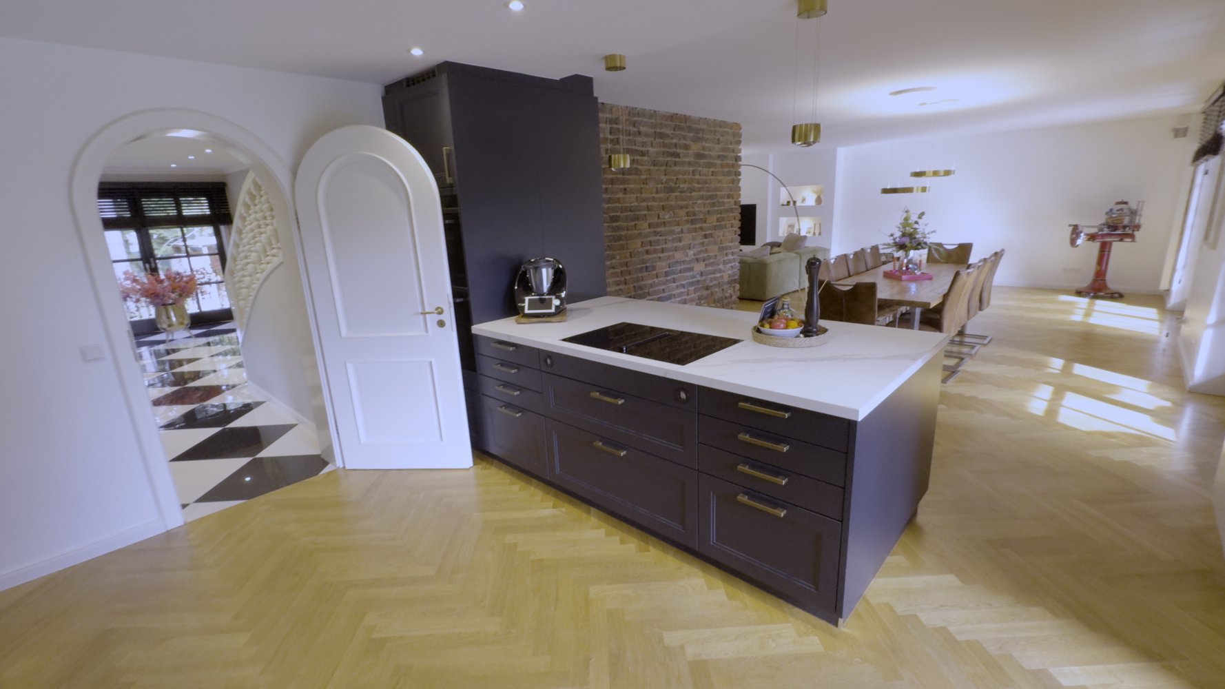 Im Erdgeschoss betreten Sie das Haus über ein repräsentatives Entree mit großen, diagonal verlegten Fliesen im Schachbrettmuster.